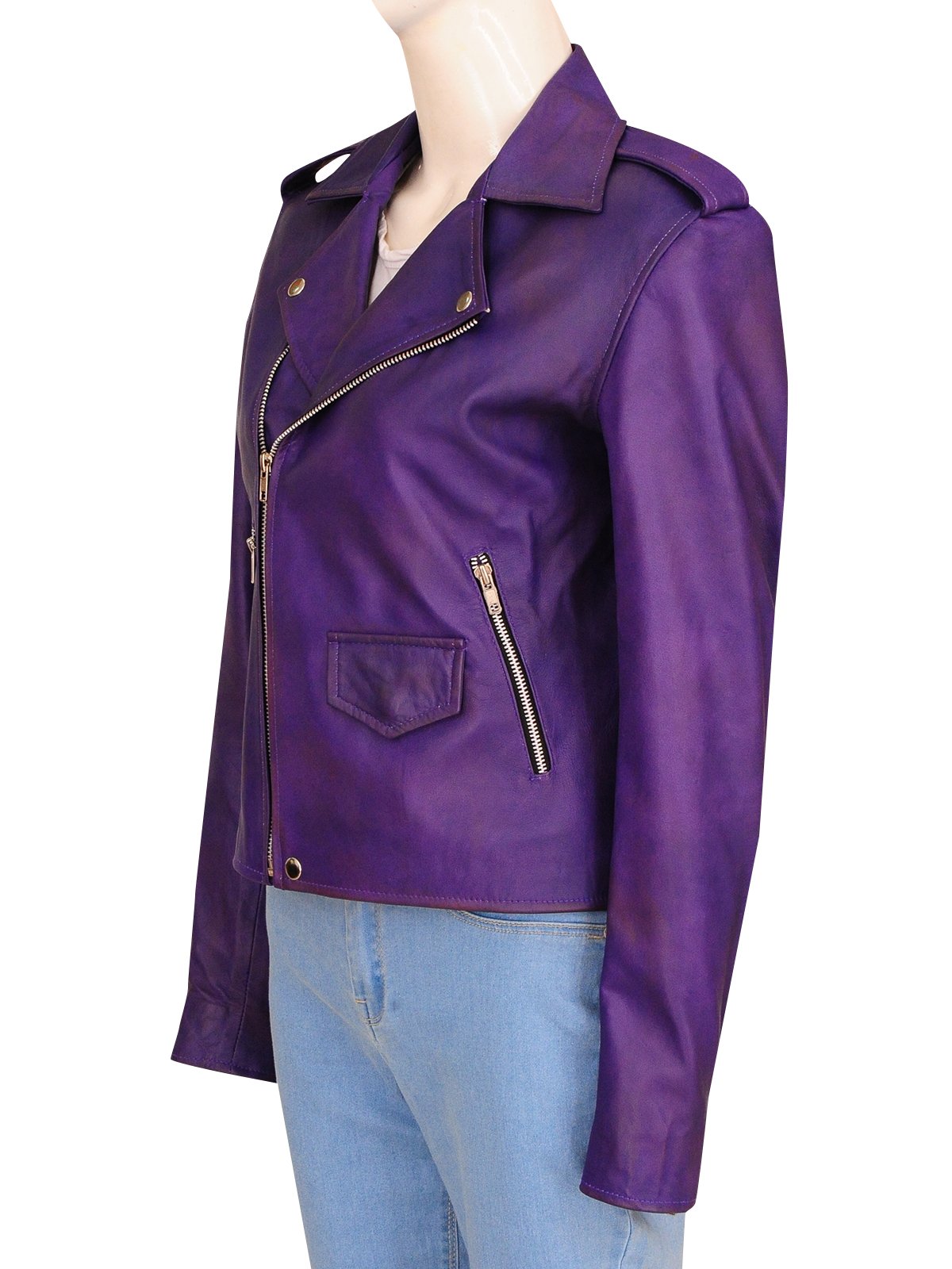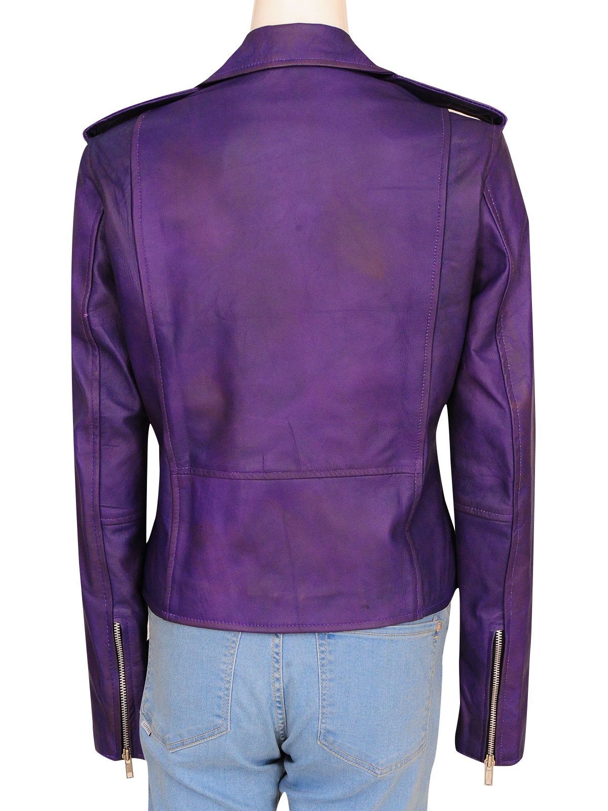 Ocean’s Eight Daphne Kluger Jacket is made up of genuine leather material. It is available in purple color. This product has a lapel design collar and front branded zipper closure design. This Jacket has an internal viscose lining and full sleeves with zipper cuffs. It also has two waist zipper pockets, internal pocket and there is epaulets design on the shoulder.